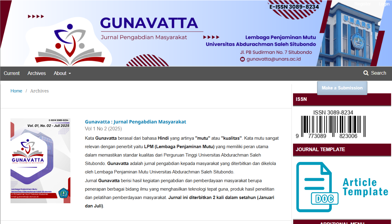 Jurnal GUNAVATTA merupakan jurnal ilmiah yang dikelola dan diterbitkan di bawah naungan Lembaga Penjaminan Mutu (LPM) Universitas Abdurachman Saleh (UNARS) Situbondo. Kehadiran jurnal ini menjadi salah satu wujud komitmen LPM UNARS dalam mendorong budaya mutu akademik, khususnya dalam pengembangan dan diseminasi karya ilmiah yang relevan dengan peningkatan kualitas pendidikan, penelitian, dan pengabdian kepada masyarakat. Melalui pengelolaan jurnal yang sistematis dan terstandar, GUNAVATTA berperan sebagai media publikasi ilmiah Pengabdian Kepada Masyarakat (PKM) yang mendukung pelaksanaan Tridharma Perguruan Tinggi secara berkelanjutan.